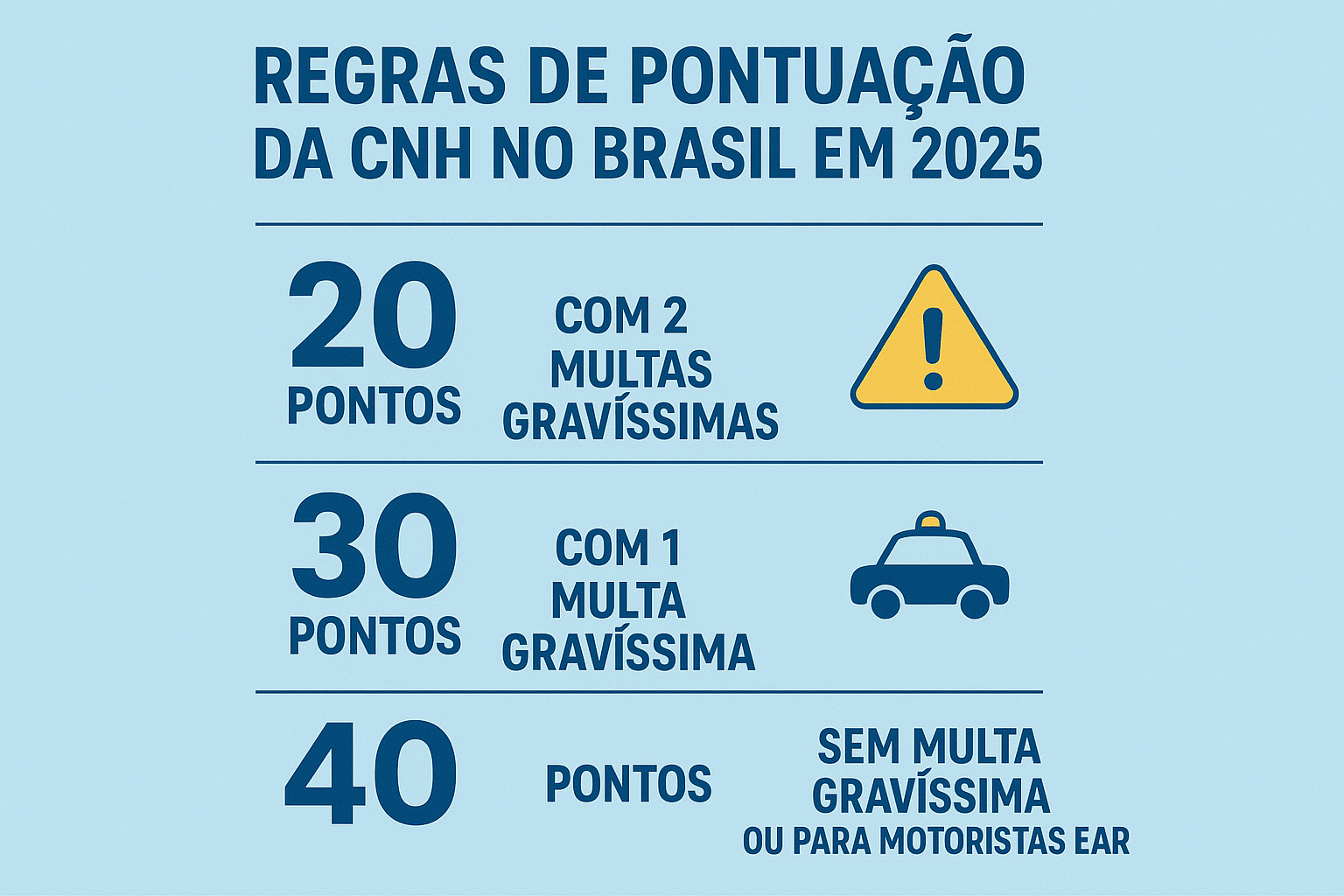 Além disso, o sistema diferencia condutores comuns dos que exercem atividade remunerada (EAR), permitindo que estes atinjam até 40 pontos independentemente das multas cometidas.